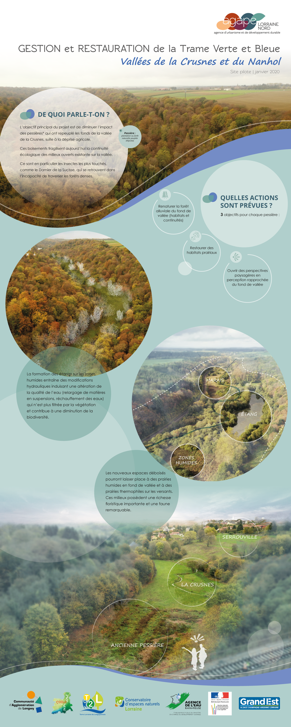 En 2018, l’AGAPE et le Conservatoire d’Espaces Naturels de Lorraine (CENL) en partenariat avec l’Agglomération du Grand Longwy (AGL), Terre Lorraine du Longuyonnais (T2L) et Coeur du Pays-Haut (CPH), ont déposé un dossier AMI TVB pour protéger et restaurer la Vallée de la Crusnes et du Nanhol sur une période de 3 ans (2019-2020-2021).