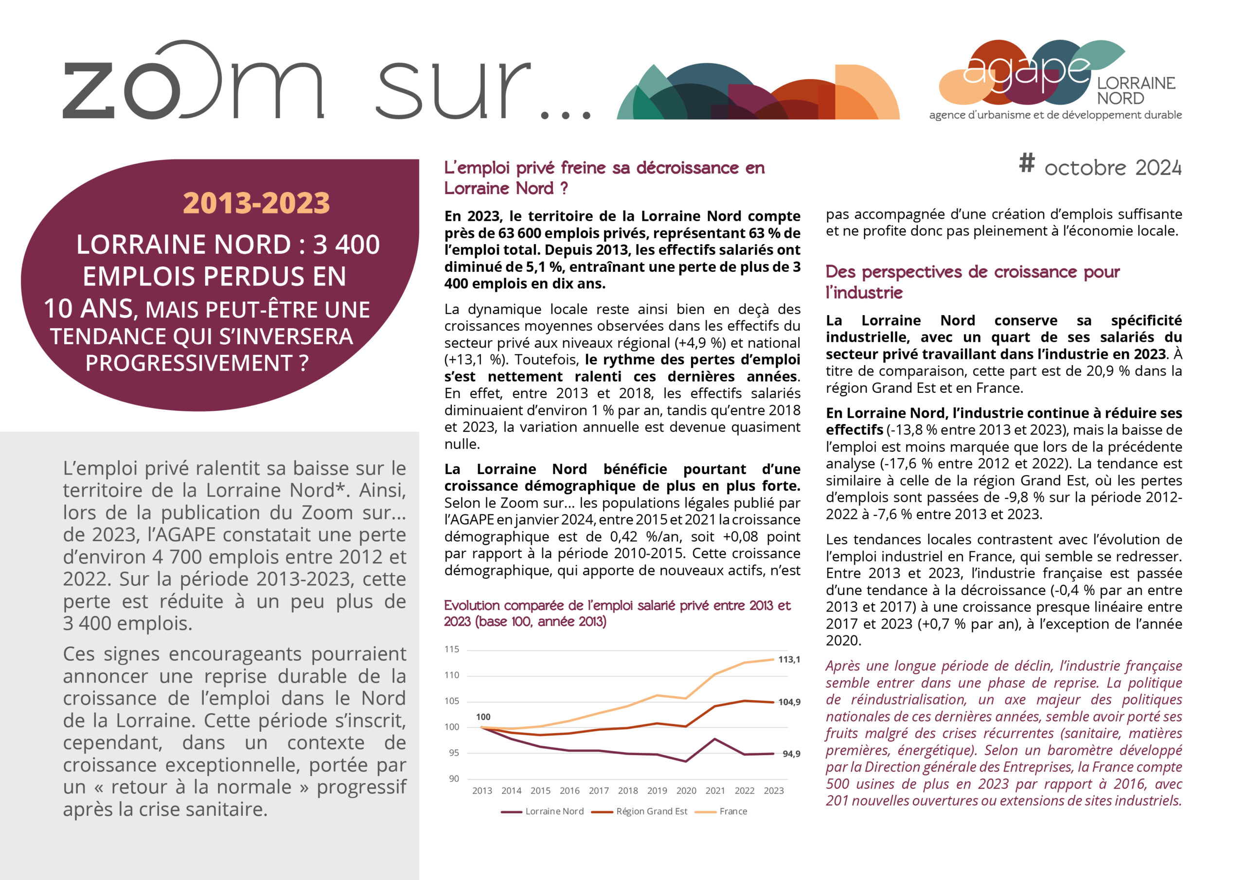 L’AGAPE publie son analyse annuelle sur l’évolution 2013-2023 de l’emploi privé. La baisse de l’emploi privé ralentit en Lorraine Nord, par rapport à la période 2012-2022.